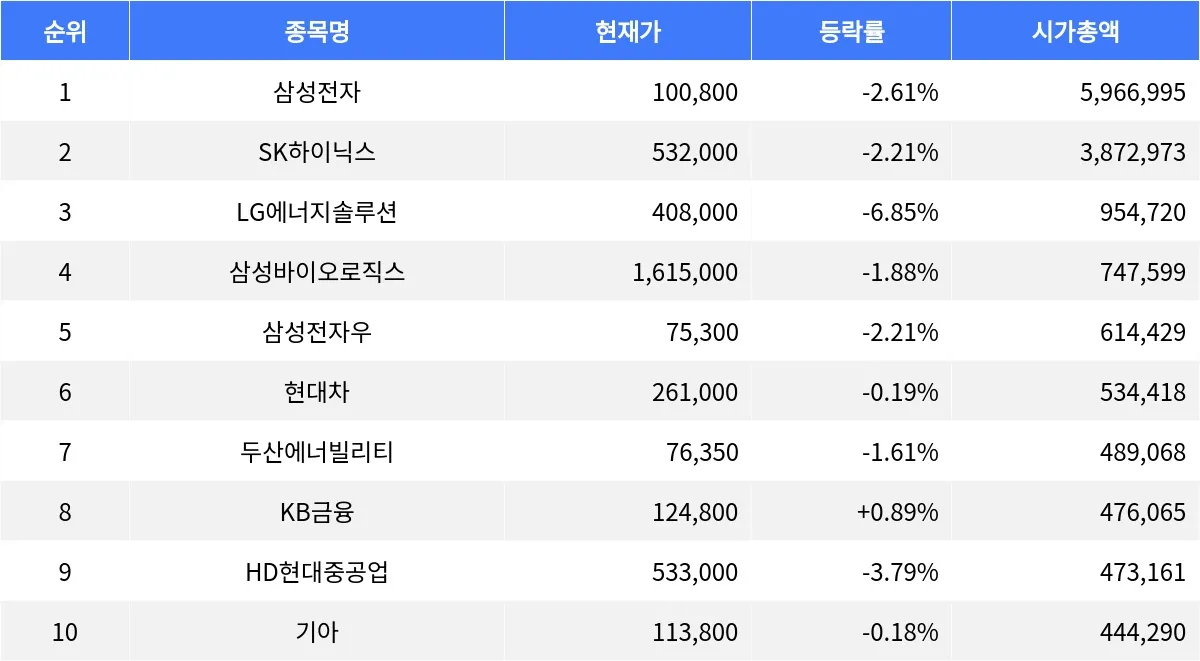 삼성전자 -2.61%, SK하이닉스 -2.21%, LG에너지솔루션 -6.85%...