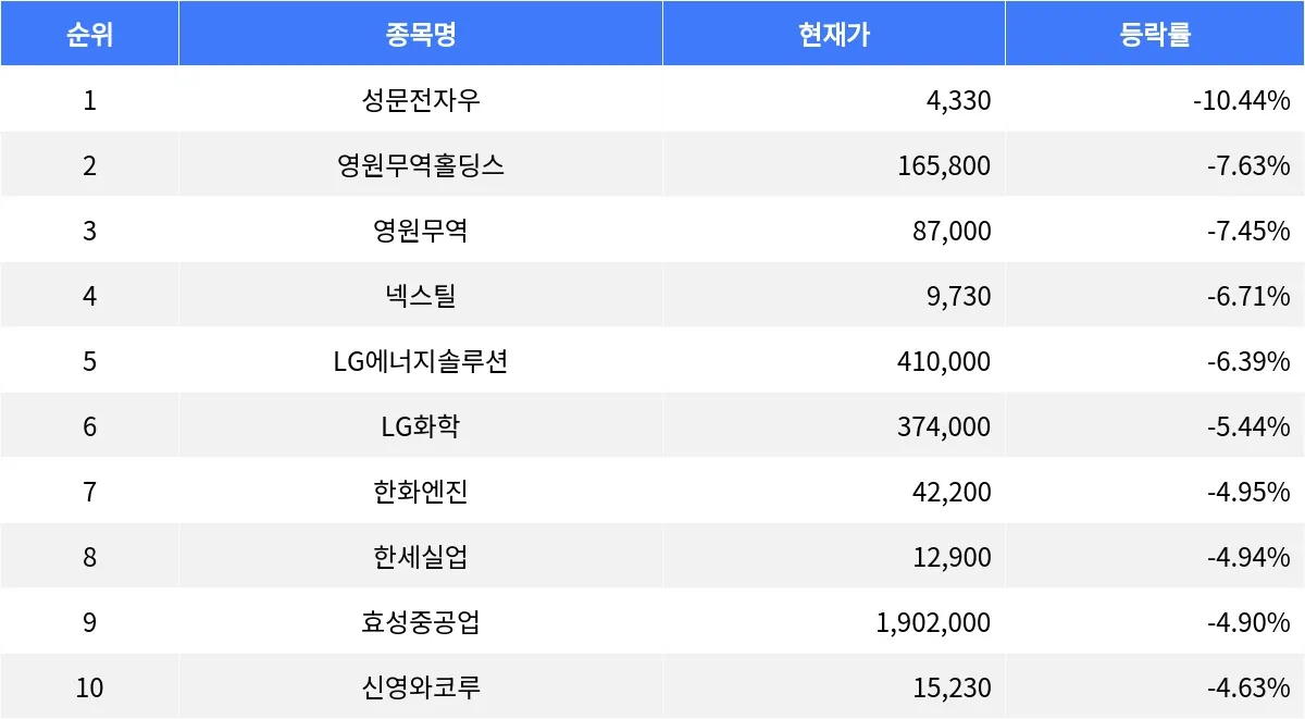 28일 장 마감 기준, 성문전자우(014915)가 등락률 -10.44%로 1위를 차지했다. 성문전자우는 현재가 4,330원으로 전 거래일 대비 10.44% 하락했다. 거래량은 20,774주로 매수총잔량 240주 대비 매도총잔량이 3,215주로 크게 많아 매도세가 강하게 나타났다. PER은 33.05로 확인되며, ROE는 제공되지 않았다.영원무역홀딩스(009970)는 현재가 165,800원으로 전 거래일 대비 7.63% 하락했다. 거래량은 32,018주이며, 매수총잔량 204주와 매도총잔량 299주로 매도세가 다소 우세했다. PER은 6.94, ROE는 13.17로 나타났다.
