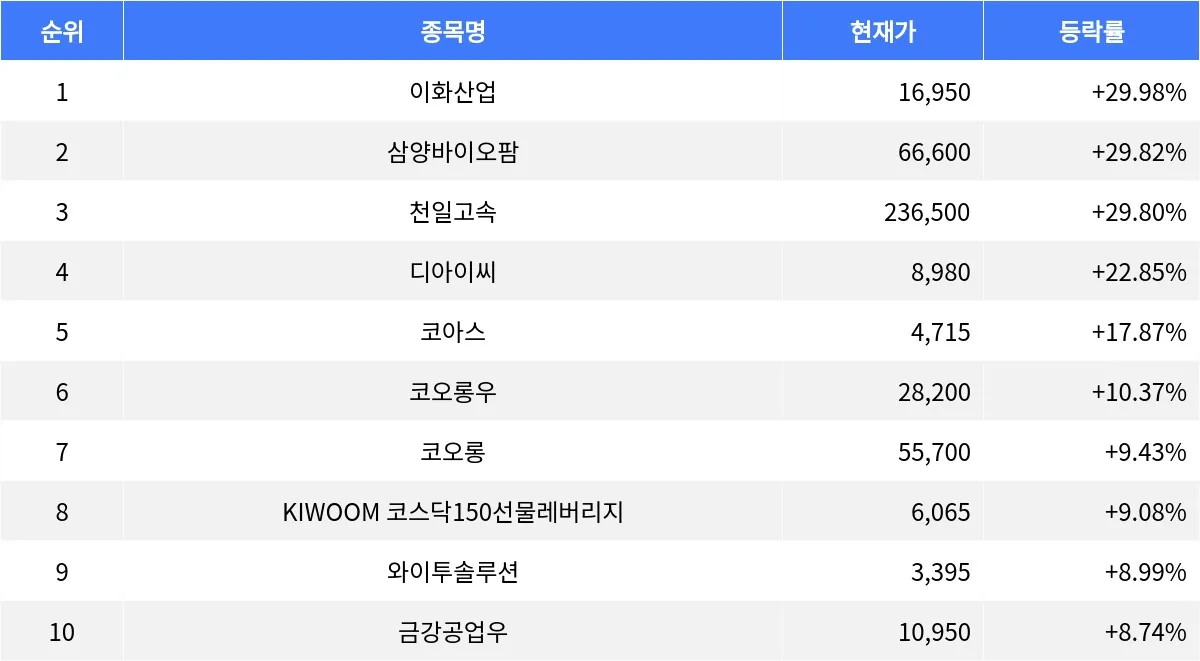 28일 장 마감 기준, 이화산업(000760)이 등락률 +29.98%로 1위를 차지했다. 이화산업의 현재가는 16,950원으로, 매수 우위 속에서 매도 총잔량이 0으로 나타나며 투자자들의 강한 매수세를 보여주었다. PER은 -50.00, ROE는 0.46으로 수치상으로는 다소 부진했으나, 높은 거래량이 이를 상쇄했다.