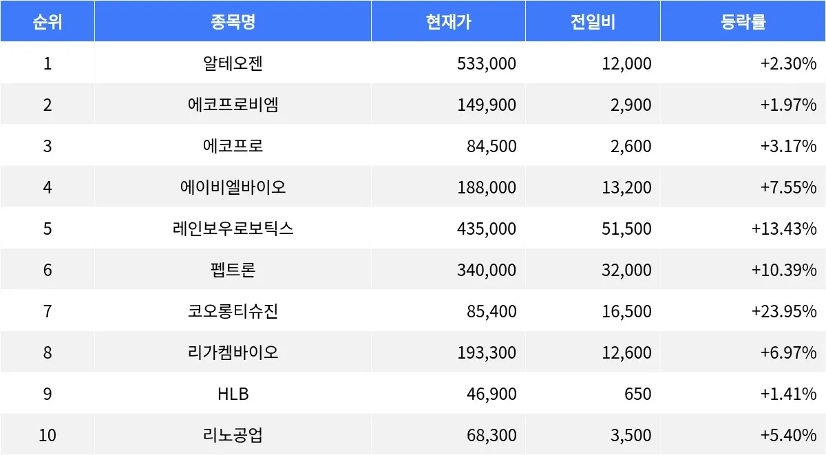 알테오젠 +2.30%, 에코프로비엠 +1.97%, 에코프로 +3.17%...