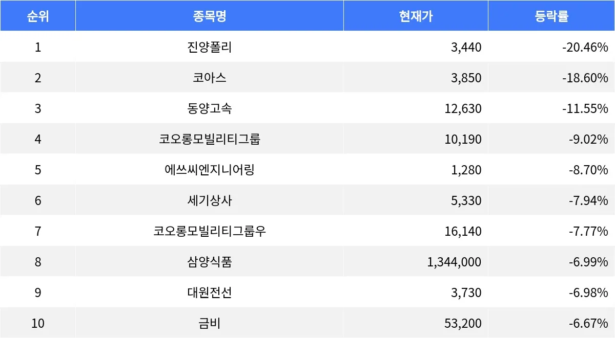 1일 장 마감 기준, 진양폴리(010640)가 등락률 -20.46%로 1위를 차지했다.