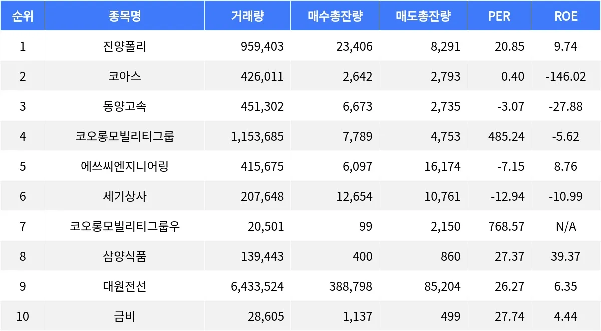 진양폴리의 거래량은 959,403주로 매수총잔량이 매도총잔량보다 많아 매수세가 강했다. 코아스는 매도총잔량이 매수총잔량보다 많아 매도세가 우위를 점했다. 동양고속과 코오롱모빌리티그룹은 매수세가 매도세를 앞섰다. 에쓰씨엔지니어링은 매도세가 매수세를 크게 앞섰다.
