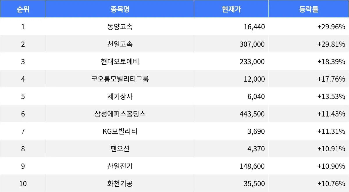 삼성에피스홀딩스(0126Z0)는 등락률 +11.43%로 6위를, 현재가는 443,500원이었다. KG모빌리티(003620)은 등락률 +11.31%로 7위를 기록하며, 현재가는 3,690원이었다. 팬오션(028670)의 등락률 +10.91%로 8위를 차지했고, 현재가는 4,370원이었다. 산일전기(062040)는 등락률 +10.90%로 9위를 기록하며, 현재가는 148,600원이었다. 마지막으로, 화천기공(000850)는 등락률 +10.76%로 10위를 차지하며, 현재가는 35,500원이었다.