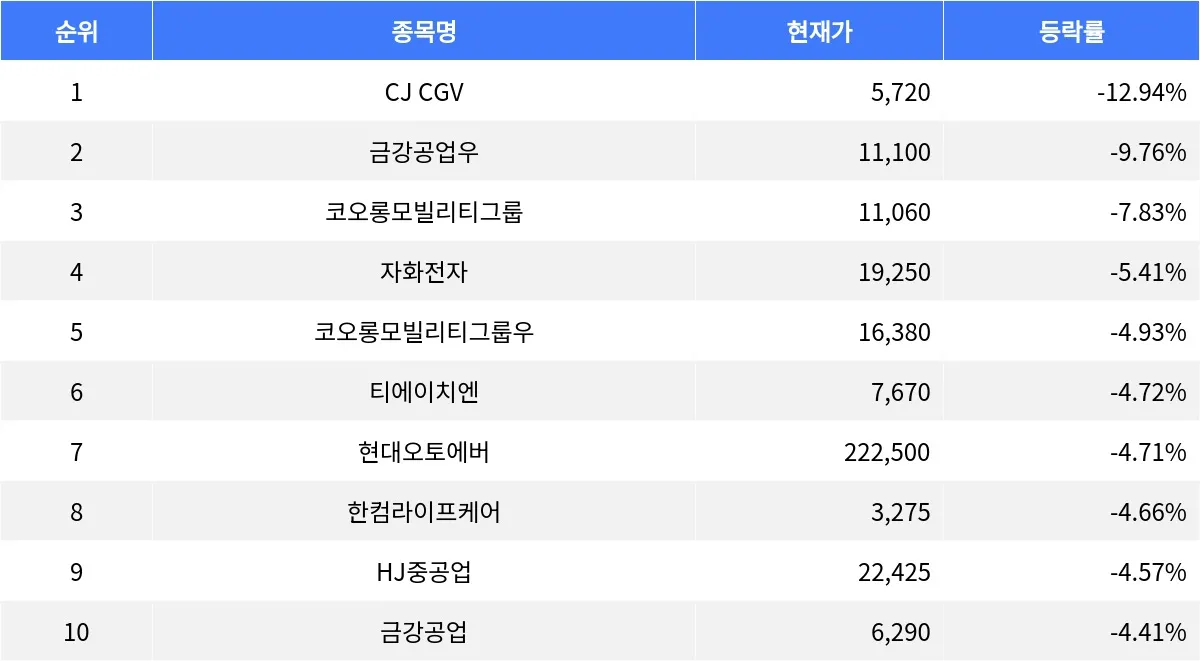 3일 장 마감 기준, CJ CGV(079160)가 등락률 -12.94%로 1위를 차지했다. CJ CGV의 현재가는 5,720원으로 전 거래일 대비 큰 폭으로 하락했다. 거래량은 3,406,188주였으며, 매수총잔량은 77,265주, 매도총잔량은 27,427주로, 매수세가 우위를 보였다. PER은 -3.99, ROE는 -30.74로 나타났다.