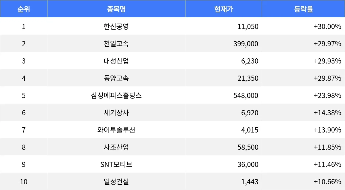 천일고속과 대성산업 등 상한가 기록, 매수세 강세 종목 다수 확인