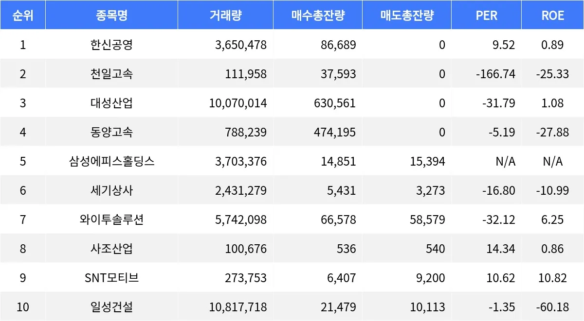 3일 장 마감 기준, 한신공영(004960)이 등락률 +30.00%로 1위를 차지했다. 한신공영의 현재가는 11,050원으로, 공모가 대비 상한가를 기록했다. 거래량은 3,650,478주로 활발하게 거래되었으며, 매수총잔량은 86,689주로 매도총잔량이 0주인 점을 감안할 때 매수세가 강한 상태였다. PER은 9.52, ROE는 0.89였다.