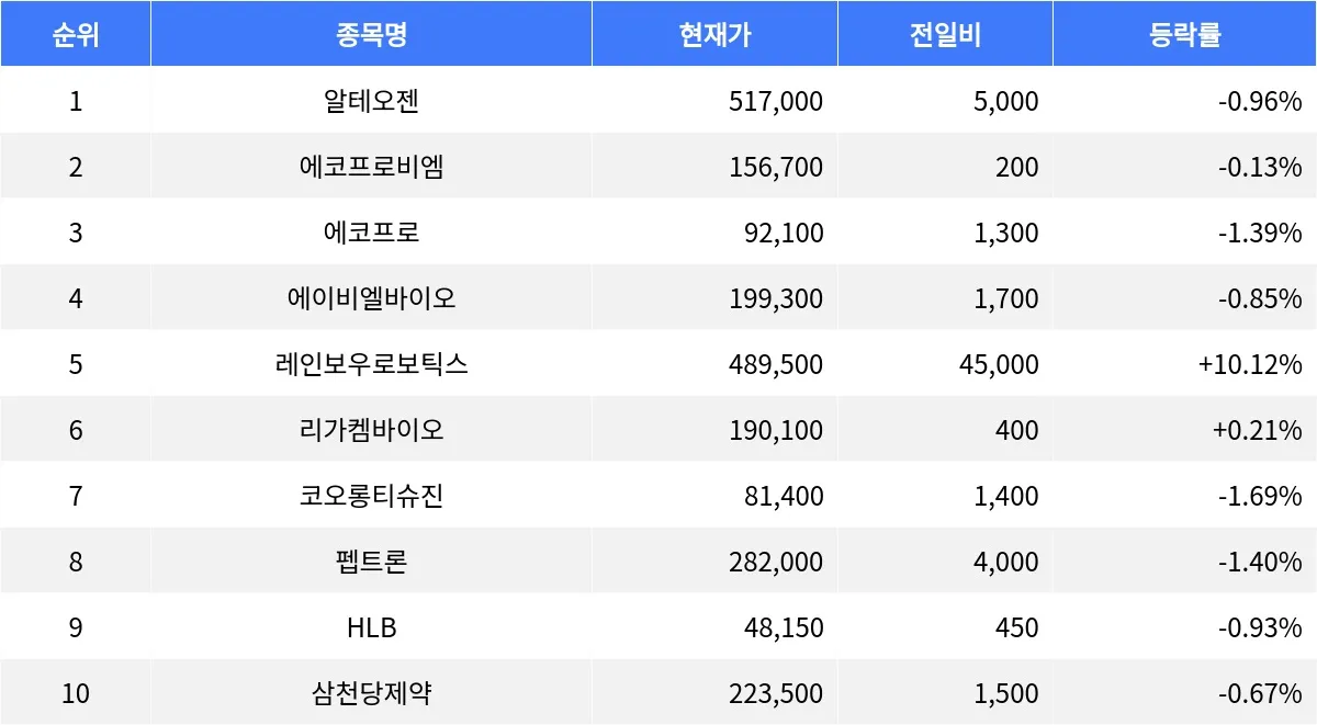 알테오젠 -0.96%, 에코프로비엠 -0.13%, 에코프로 -1.39%...