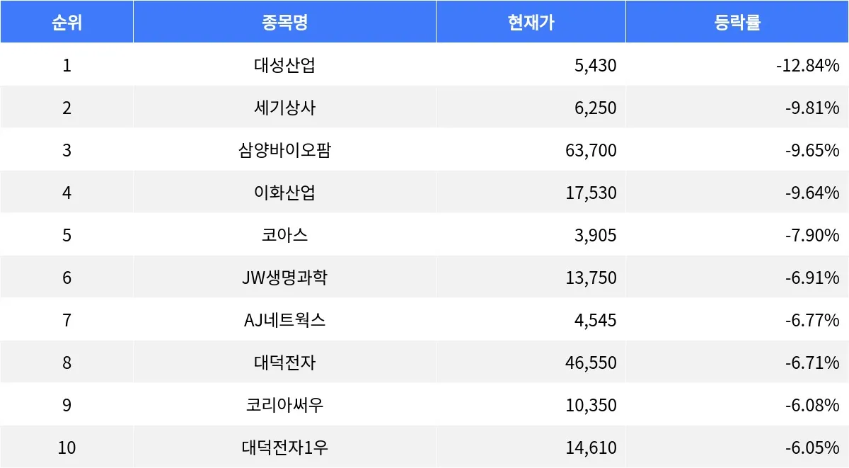 4일 장 마감 기준, 대성산업(128820)이 등락률 -12.84%로 1위를 차지했다. 대성산업의 현재가는 5,430원으로, 전 거래일 대비 하락했다. 거래량은 18,092,523주로 활발하게 거래되었다. 매수총잔량은 69,024주, 매도총잔량은 34,947주로 매수세가 우세했다. PER은 -27.70이었고, ROE는 1.08이었다.