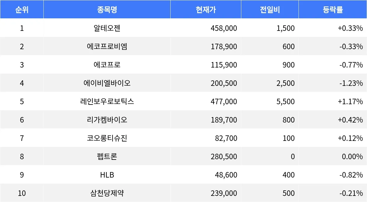 4위 에이비엘바이오(298380)는 20만500원으로 전일 대비 1.23% 하락하고 있으며, 거래량은 51,213주다. 8위 펩트론(087010)은 28만500원으로 전일 대비 보합세를 보이며, 거래량은 13,647주다. 9위 HLB(028300)는 4만8,600원으로 전일 대비 0.82% 하락하고 있으며, 거래량은 15,319주를 기록하고 있다. 10위 삼천당제약(000250)은 23만9,000원으로 0.21% 하락 중이며, 거래량은 6,022주다.