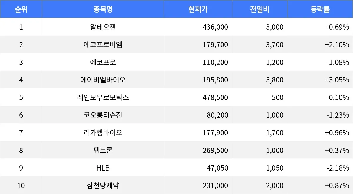 알테오젠 +0.69%, 에코프로비엠 +2.10%, 에코프로 -1.08%...