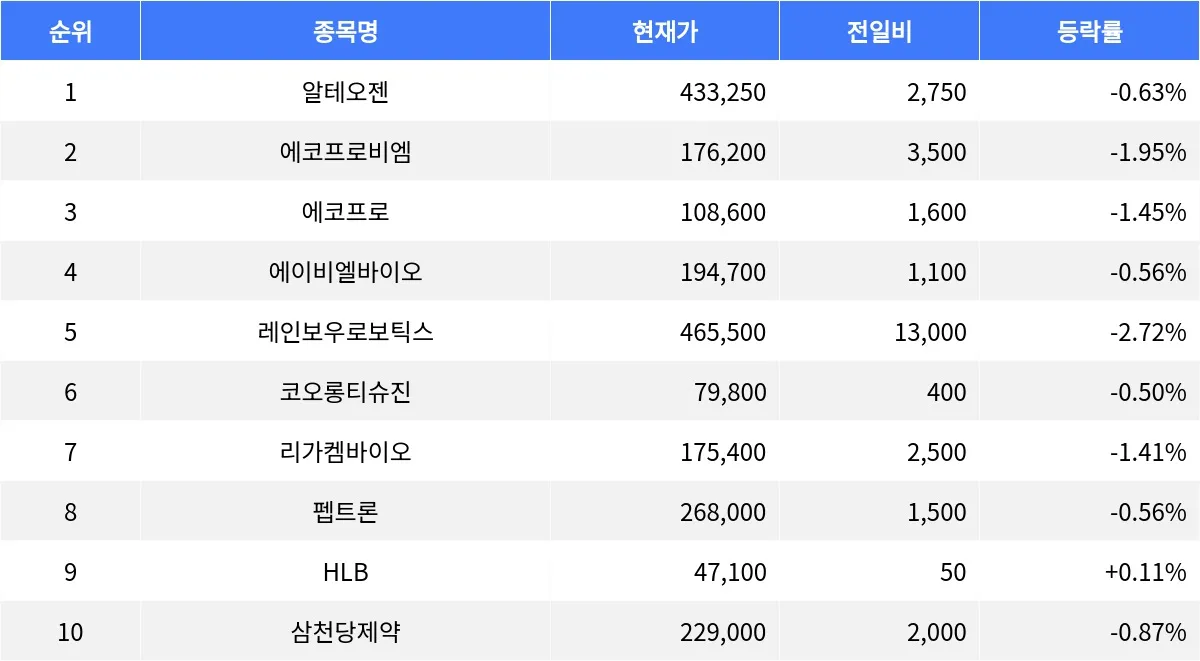 시가총액 3위인 에코프로(086520)는 108,600원으로 1.45% 내려갔다. 거래량은 167,187주로 집계되었으며, 외국인비율은 21.46%다. 에이비엘바이오(298380)는 194,700원으로 0.56% 하락했고, 거래량은 37,546주다. 레인보우로보틱스(277810)는 465,500원으로 2.72% 하락하며, 거래량은 18,939주를 기록하고 있다. 리가켐바이오(141080)는 175,400원으로 1.41% 하락했다.