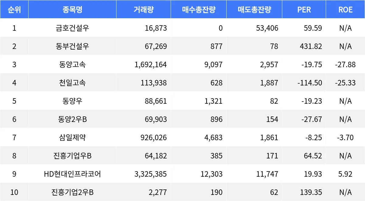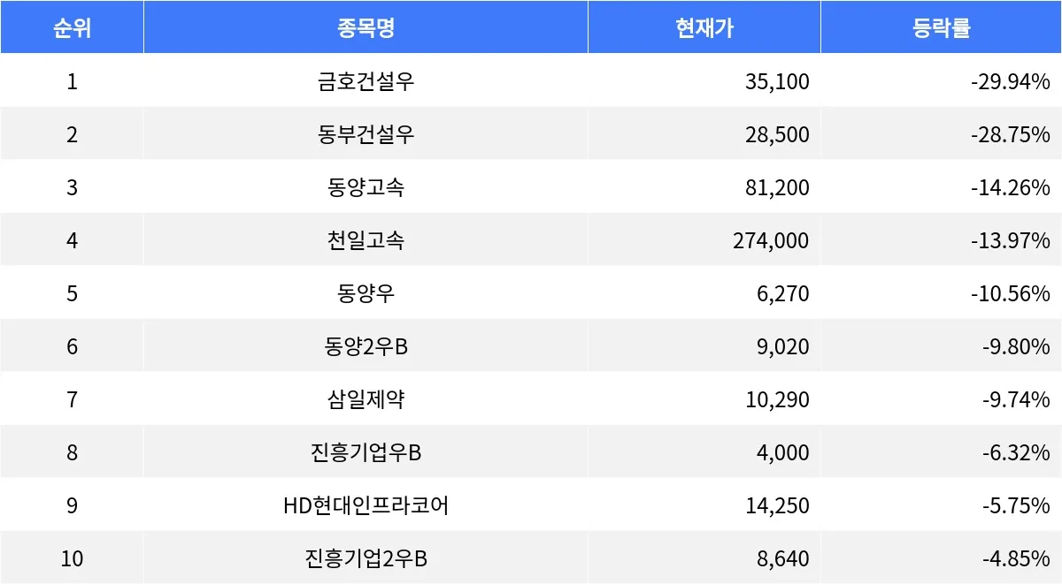 22일 장 마감 기준, 금호건설우(002995)이 등락률 -29.94%로 1위를 차지했다. 금호건설우는 현재가 35,100원으로, 전 거래일 대비 하한가를 기록하며 29.94% 하락했다. 매수총잔량은 0주로 매도총잔량 53,406주에 비해 현저히 적어 수급 구조가 매도 우위였다. 거래량은 16,873주였다. PER은 59.59로 나타났으며, ROE는 N/A로 제공되지 않았다.동부건설우(005965)는 현재가 28,500원으로 전 거래일 대비 28.75% 하락했다. 거래량은 67,269주였으며, 매수총잔량은 877주로 매도총잔량 78주에 비해 많았다. PER은 431.82로 나타났으며, ROE는 제공되지 않았다.