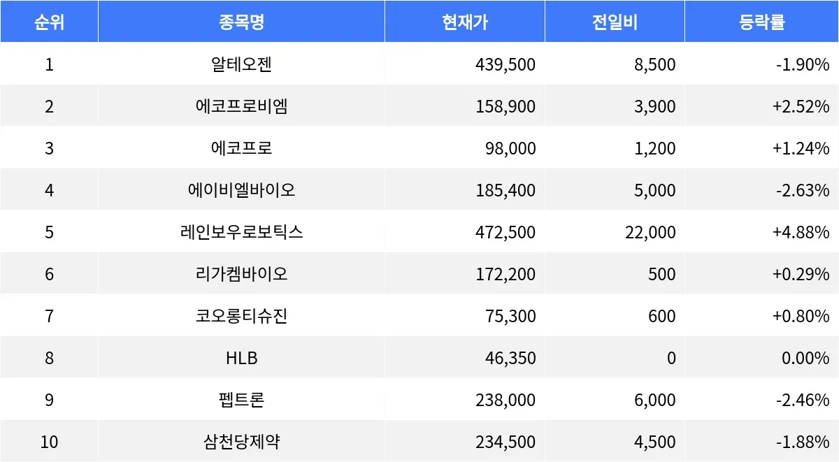 에코프로(086520)는 98,000원으로 1.24% 상승하며 거래량 2,259,391주를 기록했다. 레인보우로보틱스(277810)는 472,500원으로 4.88% 상승했고, 거래량은 254,724주였다. 리가켐바이오(141080)는 172,200원으로 0.29% 상승하며 거래량 330,185주를 기록했다. 코오롱티슈진(950160)도 75,300원으로 0.80% 상승하며 거래량 334,398주를 보였다.