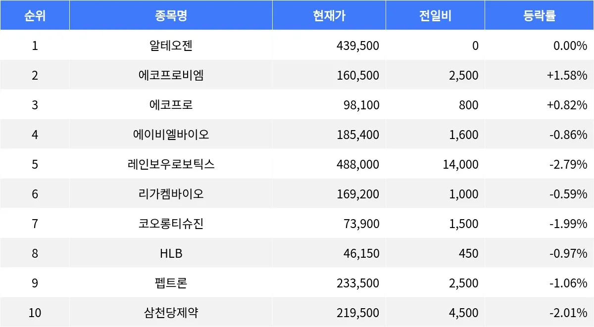 시가총액 3위 에코프로(086520)는 98,100원으로 전 거래일 대비 0.82% 상승하며, 거래량 357,649주를 기록하고 있다. 에이비엘바이오(298380)는 185,400원으로 0.86% 하락했고, 레인보우로보틱스(277810)는 488,000원으로 2.79% 하락했다.