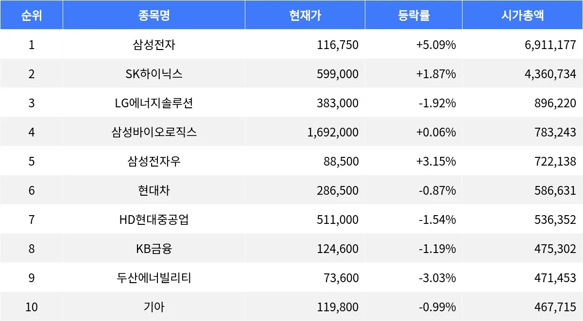 삼성전자 +5.09%, SK하이닉스 +1.87%, LG에너지솔루션 -1.92%...