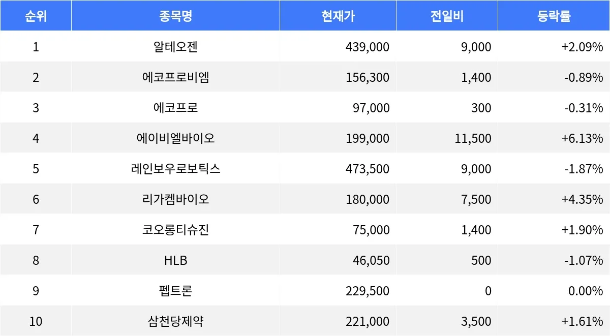 에이비엘바이오(298380)는 199,000원으로 6.13% 상승하며 강세를 보였고, 거래량은 1,693,005주로 집계되었다. 리가켐바이오(141080)도 4.35% 상승하여 긍정적인 흐름을 이어갔다. 코오롱티슈진(950160)과 삼천당제약(000250) 역시 각각 1.90%와 1.61% 상승하며 상승 종목에 포함되었다.