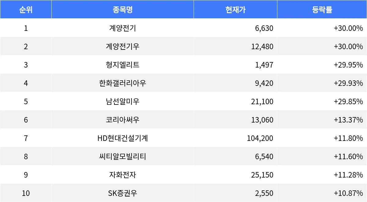 두 번째로 상승한 종목은 계양전기우(012205)로, 등락률은 30.00%였다. 현재가는 12,480원이며, 거래량은 198,353주를 기록했다. PER은 -6.02로 나타났으며, 매도총잔량이 0주로 매수세가 크게 우세했다.