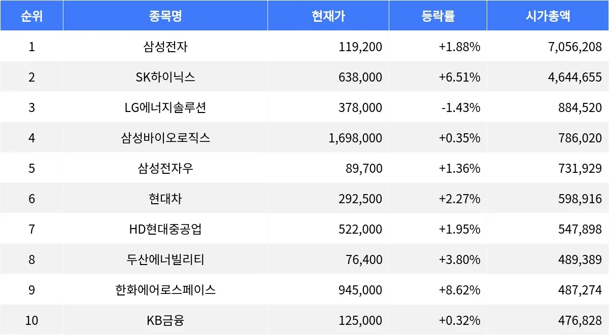 시가총액 3위부터 10위까지의 종목 중에서는 한화에어로스페이스(012450)가 8.62% 상승하며 가장 큰 폭으로 올랐다. 두산에너빌리티(034020)는 3.80%, 현대차(005380)는 2.27% 상승했다. 이 외에도 HD현대중공업(329180)(1.95%), 삼성전자우(005935)(1.36%), 삼성바이오로직스(207940)(0.35%), KB금융(105560)(0.32%) 등이 상승했다.