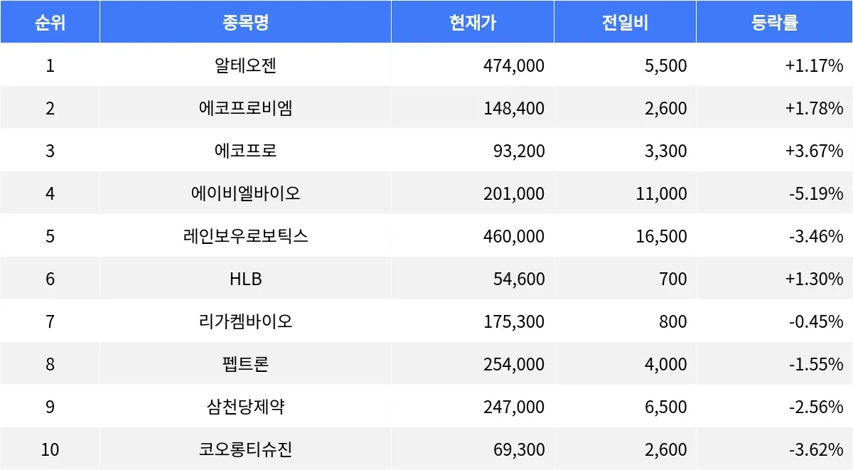 알테오젠 +1.17%, 에코프로비엠 +1.78%, 에코프로 +3.67%...