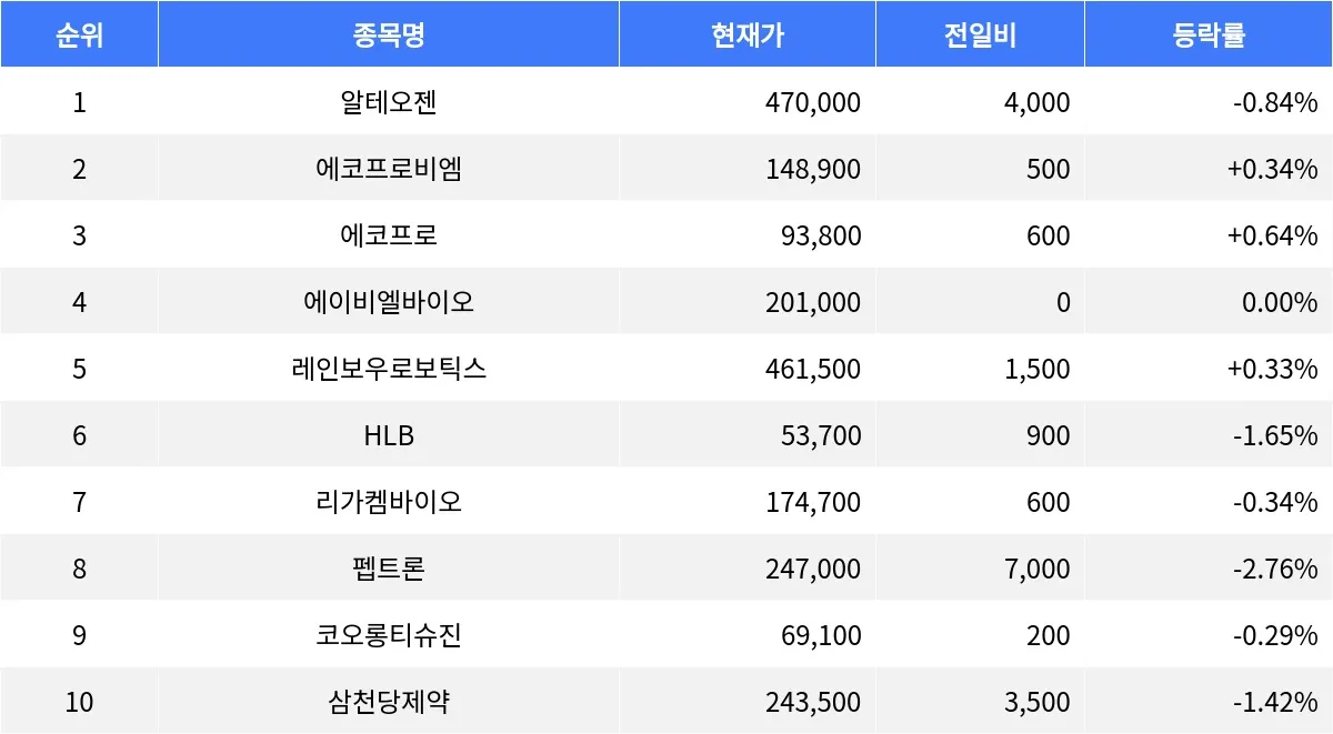 알테오젠 -0.84%, 에코프로비엠 +0.34%, 에코프로 +0.64%...