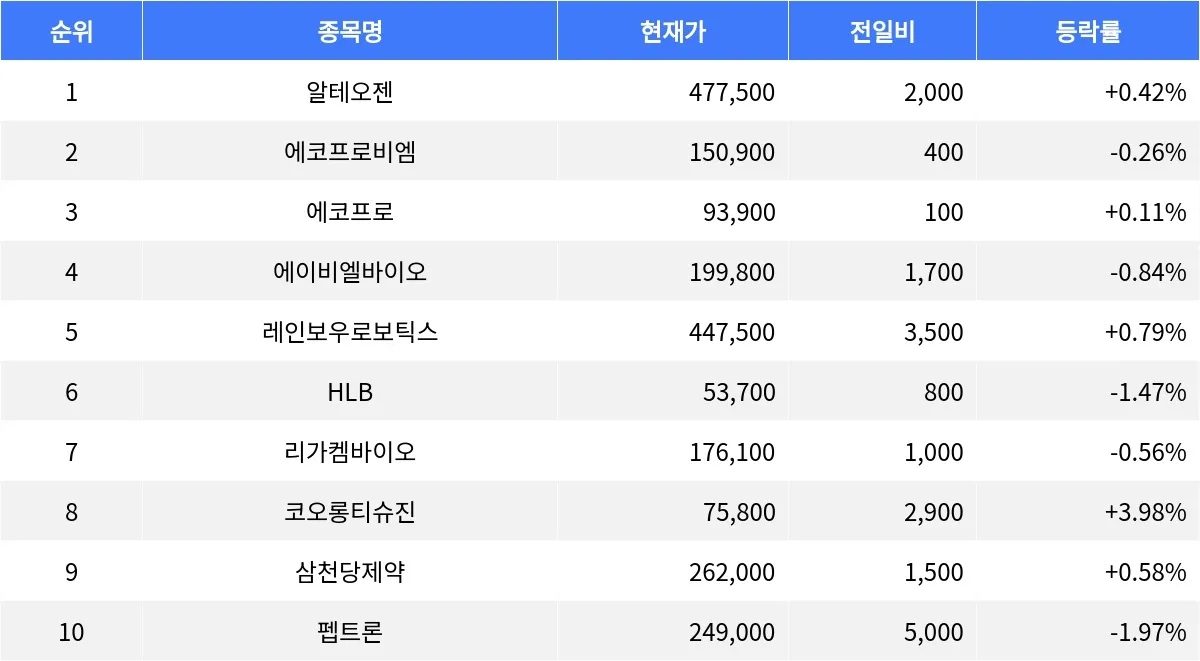 3위 에코프로(086520)는 93,900원으로 0.11% 상승하며 거래량은 186,012주이다. 5위 레인보우로보틱스(277810)는 447,500원으로 0.79% 오르며, 거래량은 9,449주를 기록하고 있다. 8위 코오롱티슈진(950160)은 75,800원으로 3.98% 상승하며, 거래량은 47,963주로 집계된다. 9위 삼천당제약(000250)은 262,000원으로 0.58% 상승하며 거래량은 24,637주이다.