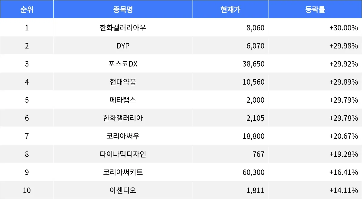 한화갤러리아(452260)는 등락률 29.78%로 2,105원에 거래를 마감했다. 코리아써우(007815)는 20.67% 상승하며 18,800원에 거래를 종료했다. 다이나믹디자인(145210)은 19.28% 상승하여 767원에 마쳤다. 코리아써키트(007810)는 16.41% 상승, 60,300원에 마무리했다. 아센디오(012170)는 14.11% 상승하며 1,811원에 거래를 마쳤다.