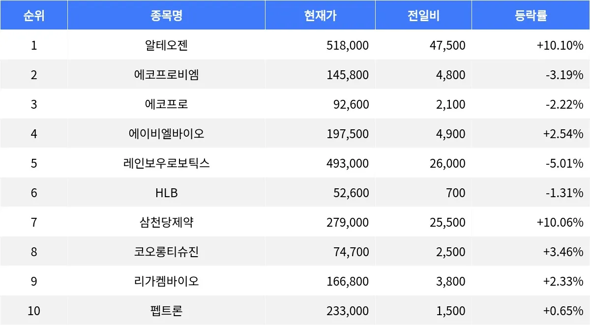 시가총액 3위부터 10위 종목 중 상승한 종목은 에이비엘바이오(298380), 삼천당제약(000250), 코오롱티슈진(950160), 리가켐바이오(141080), 펩트론(087010) 등이었다. 에이비엘바이오는 2.54% 상승했고, 거래량은 1,492,590주였다. 삼천당제약은 10.06% 올랐고, 거래량은 605,113주에 달했다. 코오롱티슈진은 3.46% 상승했으며, 거래량은 573,629주였다. 리가켐바이오는 2.33% 올랐고, 거래량은 601,672주였다. 펩트론은 0.65% 상승하며 거래량 187,468주를 기록했다.