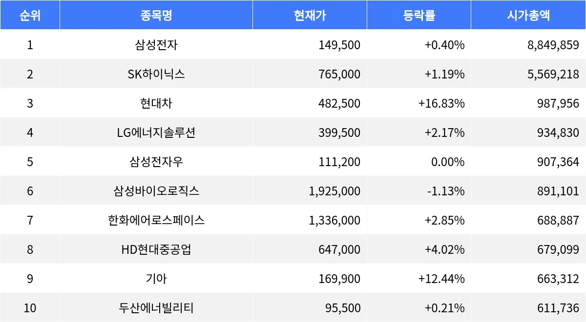 삼성전자 +0.40%, SK하이닉스 +1.19%, 현대차 +16.83%...