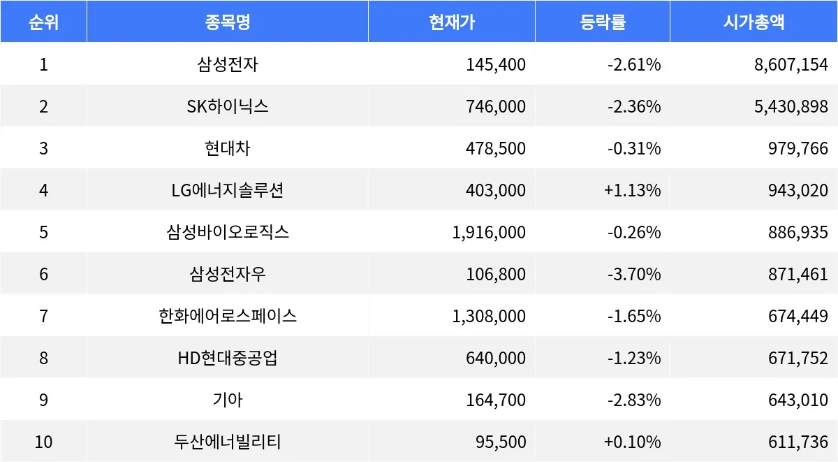 삼성전자 -2.61%, SK하이닉스 -2.36%, 현대차 -0.31%...