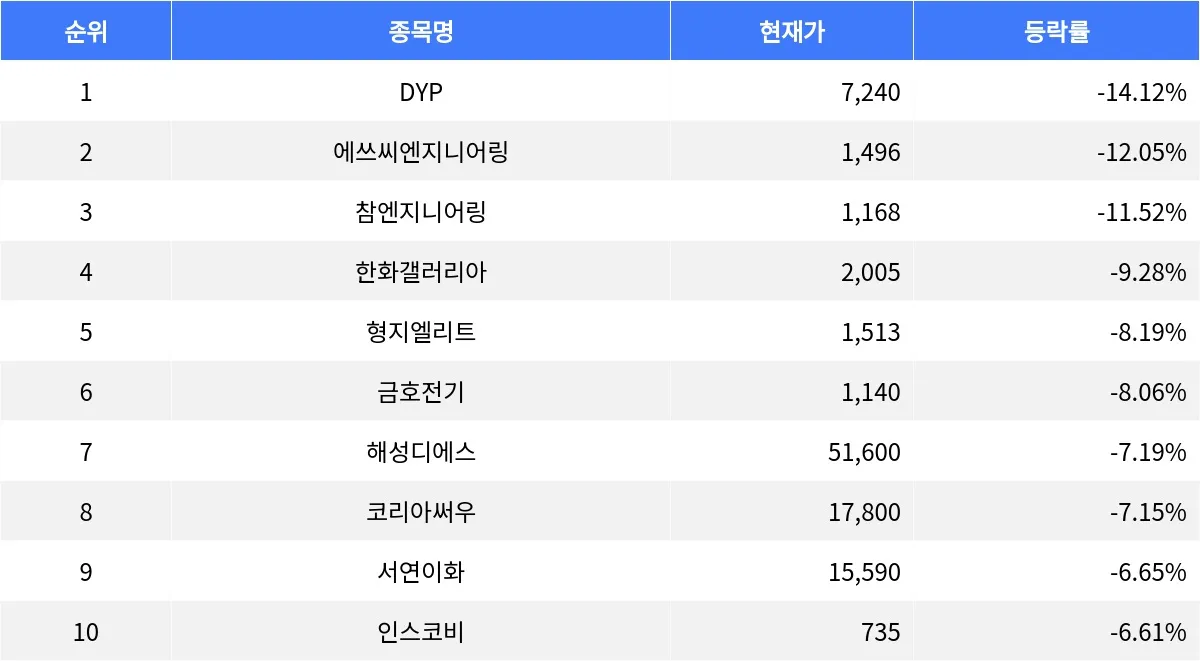 DYP, 에쓰씨엔지니어링 등 주요 종목의 하락세 주목