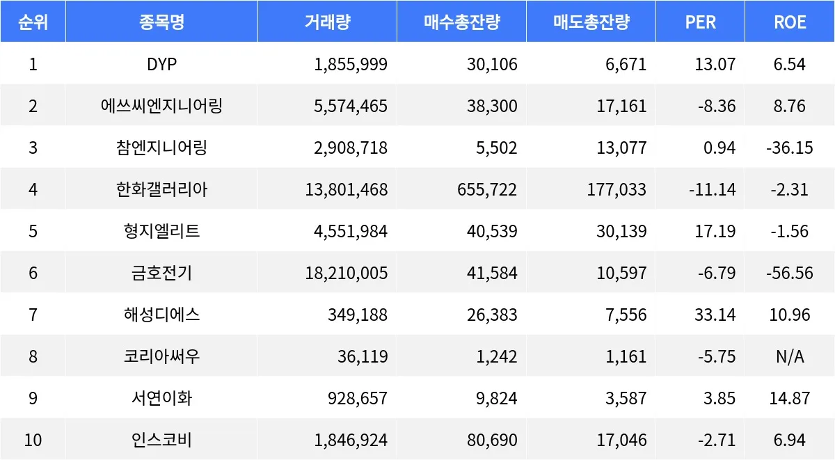 금호전기의 거래량은 18,210,005주로 매우 활발했으며, 매수총잔량 41,584주와 매도총잔량 10,597주로 매수세가 강했다. 해성디에스의 거래량은 349,188주였고, 매수총잔량 26,383주, 매도총잔량 7,556주로 매수세 우위를 보였다. 코리아써우의 거래량은 36,119주였으며, 매수총잔량은 1,242주, 매도총잔량은 1,161주로 비슷한 수준이었다. 서연이화의 거래량은 928,657주로 매수총잔량 9,824주와 매도총잔량 3,587주로 매수세가 강했다. 인스코비는 거래량 1,846,924주였으며, 매수총잔량 80,690주와 매도총잔량 17,046주로 매수세가 강했다.