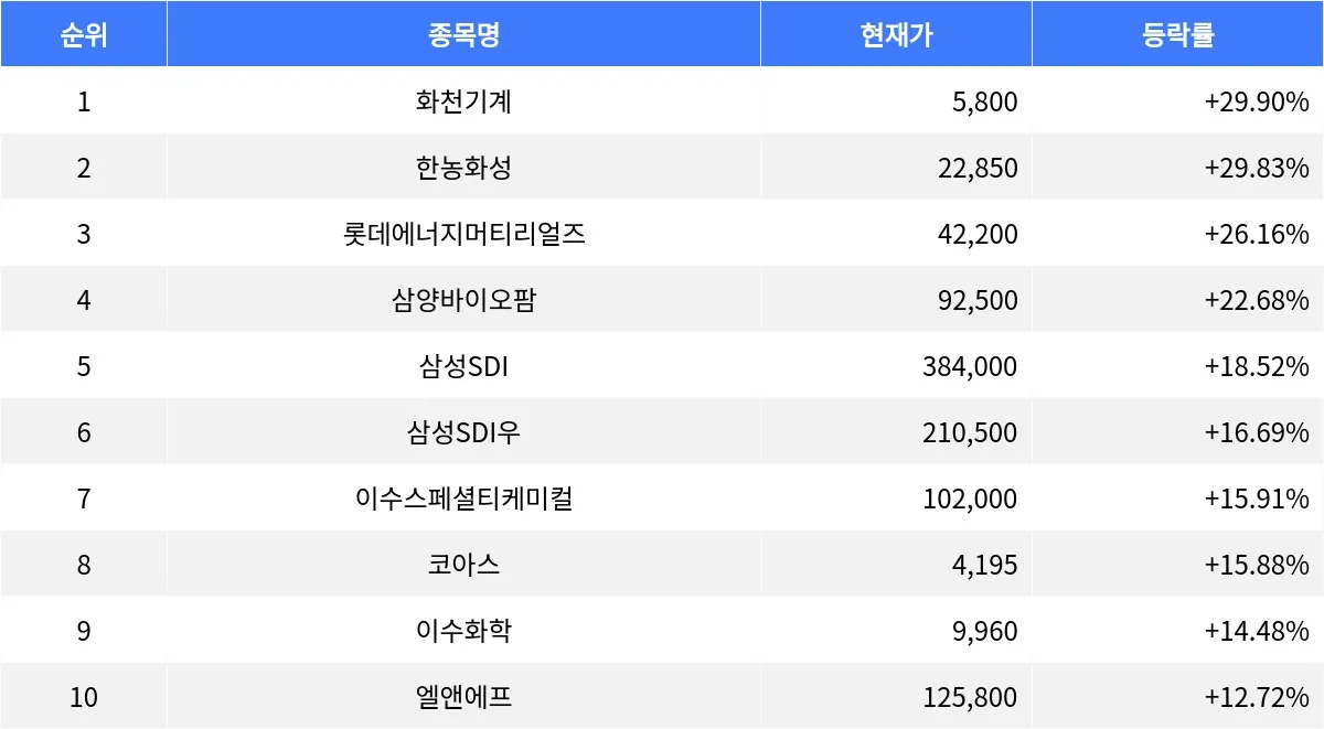 삼성SDI우(006405)는 등락률 +16.69%로 현재가 210,500원을 기록했다. 이수스페셜티케미컬(457190)은 등락률 +15.91%로 현재가 102,000원이었다. 코아스(071950)의 등락률은 +15.88%이며, 현재가는 4,195원이었다. 이수화학(005950)는 등락률 +14.48%로 현재가 9,960원이었다. 마지막으로 엘앤에프(066970)는 등락률 +12.72%로 현재가 125,800원을 기록했다.