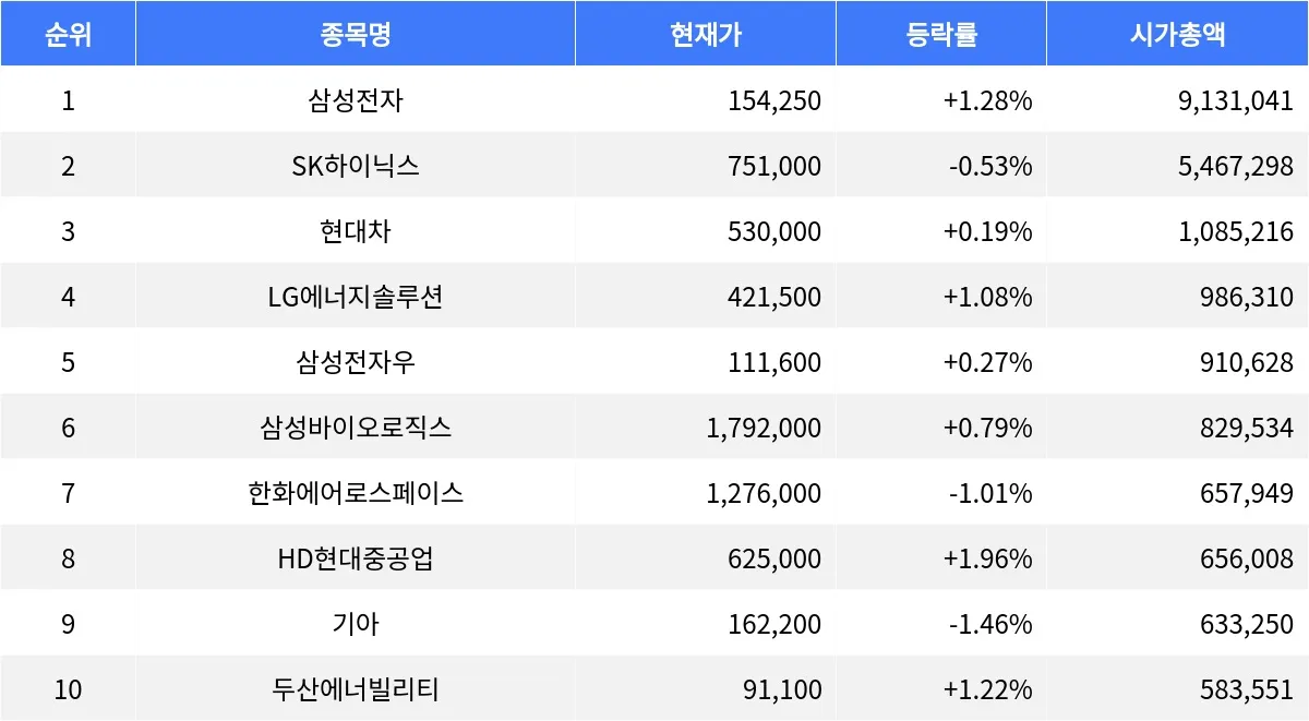 삼성전자 +1.28%, SK하이닉스 -0.53%, 현대차 +0.19%...