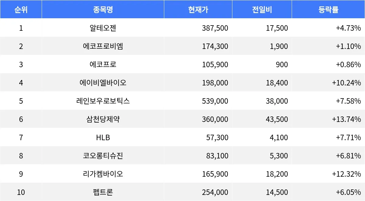에이비엘바이오(298380)는 198,000원으로 전 거래일 대비 10.24% 상승했고, 거래량은 1,714,125주였다. 삼천당제약(000250)은 360,000원으로 13.74% 상승하며, 거래량 1,635,225주를 기록하였다. 리가켐바이오(141080)는 165,900원으로 전 거래일 대비 12.32% 상승하며, 거래량은 796,313주로 집계되었다. 펩트론(087010)은 254,000원으로 6.05% 상승하였으며, 거래량은 322,405주로 나타났다.