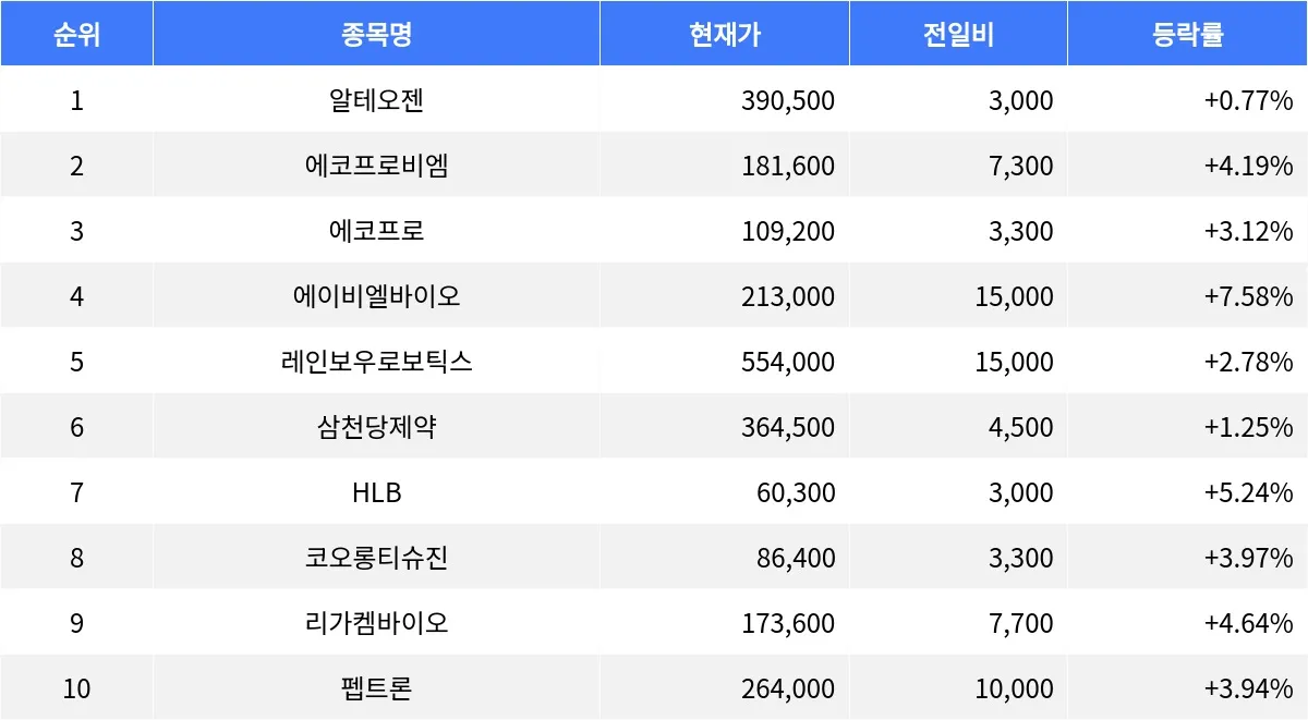 시가총액 3위 에코프로(086520)는 109,200원으로 3.12% 상승했으며, 거래량은 456,289주다. 코오롱티슈진(950160)은 86,400원으로 3.97% 상승하며, 거래량은 115,658주에 달한다. 또한, 리가켐바이오(141080)는 173,600원으로 4.64% 상승하며, 거래량은 92,056주를 기록 중이다.