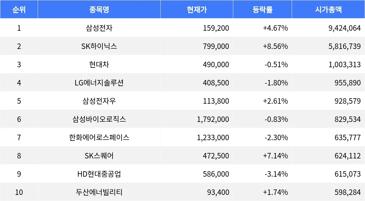 삼성전자 +4.67%, SK하이닉스 +8.56%, 현대차 -0.51%...