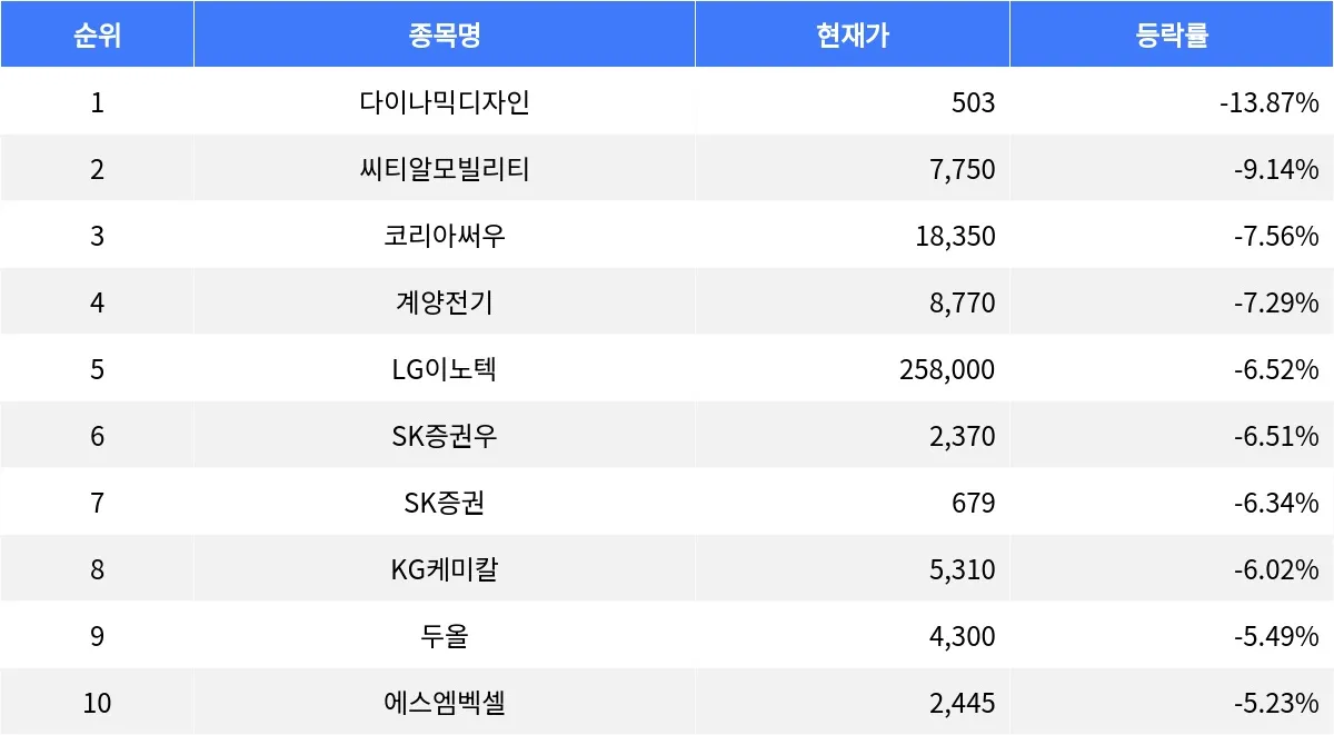 상위 하락 종목들, 다이나믹디자인부터 에스엠벡셀까지 하락폭 확대