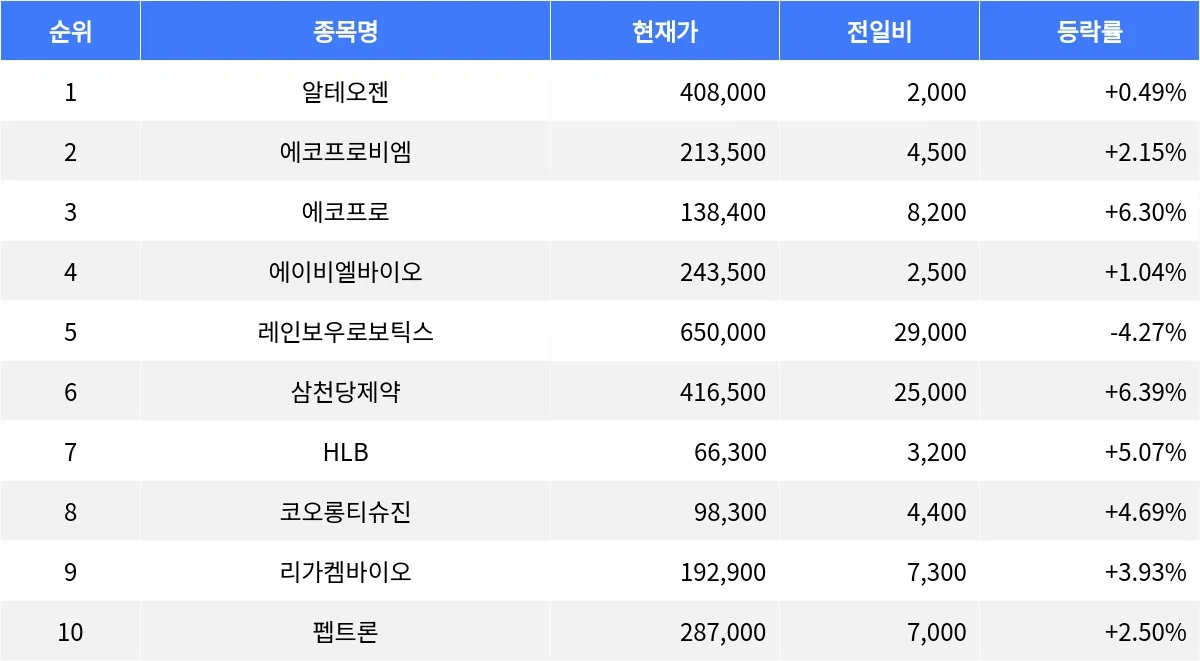 3위부터 10위까지의 종목 중에서는 에코프로(086520)가 138,400원으로 6.30% 상승하며 가장 큰 상승폭을 보였다. 삼천당제약(000250)도 416,500원으로 6.39% 상승했다. HLB(028300)는 66,300원으로 5.07% 상승했으며, 코오롱티슈진(950160)은 98,300원으로 4.69% 올랐다. 리가켐바이오(141080)는 192,900원으로 3.93% 상승했으며, 펩트론(087010)은 287,000원으로 2.50% 상승했다.