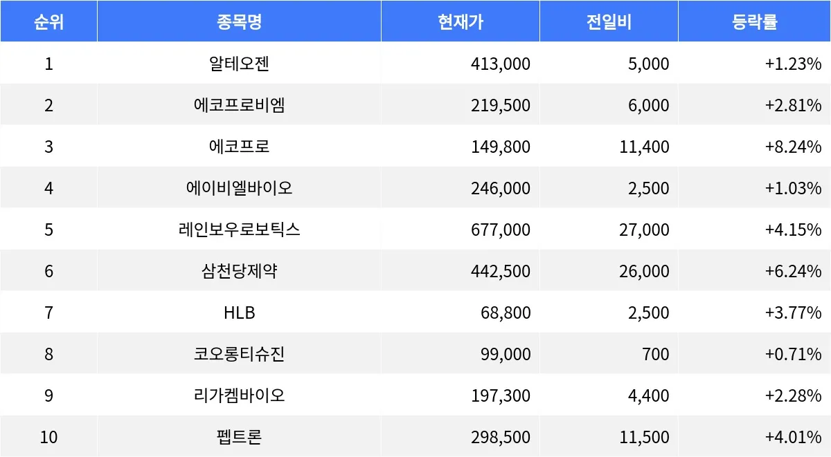에코프로(086520)는 현재가 149,800원으로 8.24% 상승하며 거래량 1,861,753주를 기록하고 있다. 레인보우로보틱스(277810)는 677,000원으로 4.15% 증가하며, 거래량 79,411주를 보이고 있다. 삼천당제약(000250)은 442,500원으로 6.24% 상승하며 거래량 73,057주를 기록 중이다. HLB(028300)는 68,800원으로 3.77% 상승하며, 거래량 518,007주를 나타내고 있다. 리가켐바이오(141080)는 197,300원으로 2.28% 상승, 거래량 97,622주를 보이고 있다.