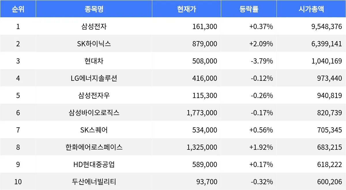 현대차(005380)는 508,000원으로 3.79% 하락하며 가장 큰 하락폭을 보인다. LG에너지솔루션(373220)은 416,000원으로 전일 대비 0.12% 하락했고, 삼성전자우(005935)는 115,300원으로 0.26% 하락세를 보인다. 삼성바이오로직스(207940)는 1,773,000원으로 0.17% 하락하며, 두산에너빌리티(034020)는 93,700원으로 0.32% 하락했다. SK스퀘어(402340)는 534,000원으로 0.56% 상승했고, 한화에어로스페이스(012450)는 1,325,000원으로 1.92% 상승했다. HD현대중공업(329180)은 589,000원으로 0.17% 상승세를 보인다.