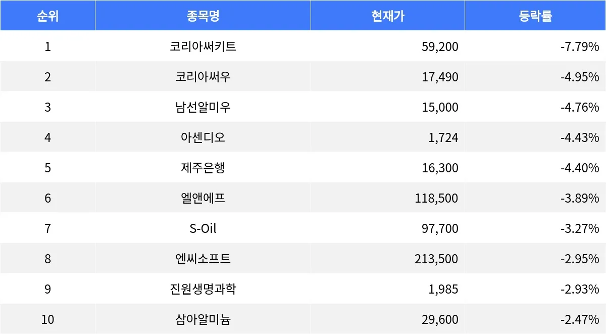 3일 장 마감 기준, 코리아써키트(007810)이 등락률 -7.79%로 1위를 차지했다. 코리아써키트는 전 거래일 대비 -7.79% 하락하며 59,200원에 거래를 마쳤다. 거래량은 1,381,936주로 집계되었으며, PER은 -19.13, ROE는 -31.05로 나타났다. 매수총잔량 49,159주가 매도총잔량 11,550주를 크게 상회하며 매수 우위의 수급 구조를 보였다.