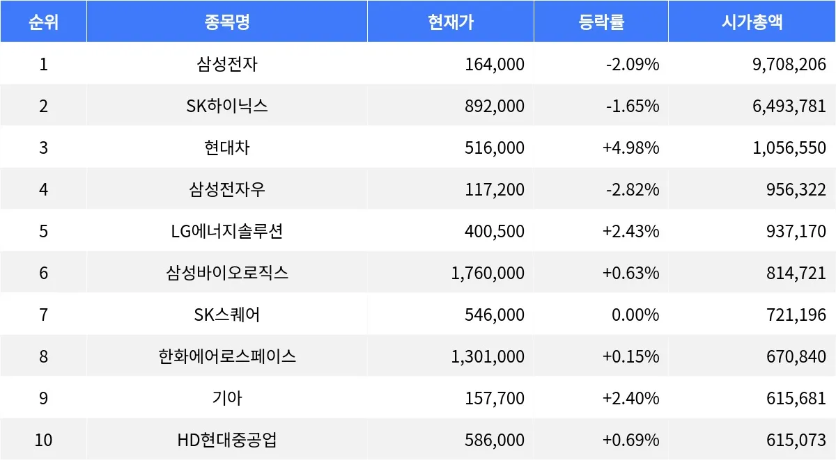 삼성전자 -2.09%, SK하이닉스 -1.65%, 현대차 +4.98%...