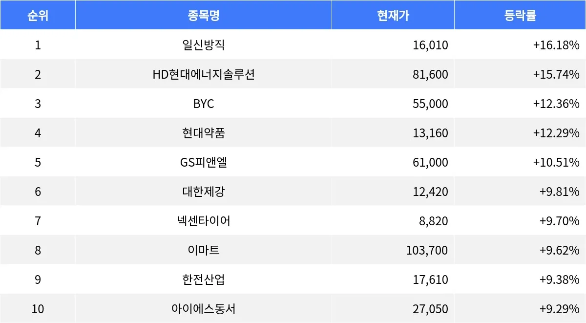 대한제강(084010)은 등락률 9.81%로 현재가 12,420원을 기록했다. 넥센타이어(002350)은 8,820원으로 9.70% 상승했다. 이마트(139480)은 103,700원으로 9.62% 올랐다. 한전산업(130660)은 17,610원으로 9.38% 증가했다. 마지막으로, 아이에스동서(010780)은 27,050원으로 9.29% 상승했다.