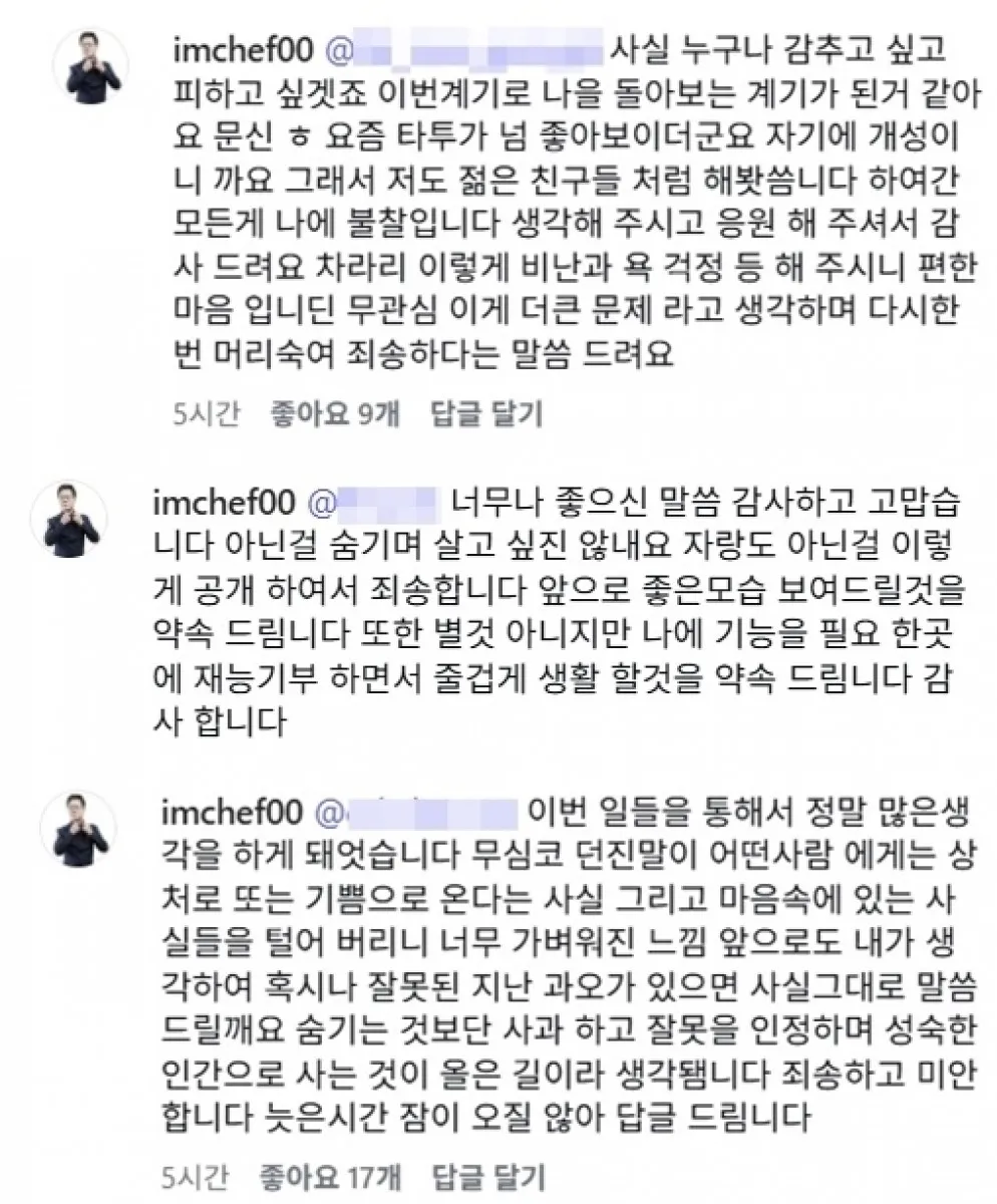 국가공인 조리기능장 임성근이 과거 음주운전으로 세 차례 적발된 사실을 뒤늦게 고백한 뒤 자신의 소셜미디어(SNS)에 댓글을 달아 심경을 밝혔다. 자료 : 임성근 인스타그램