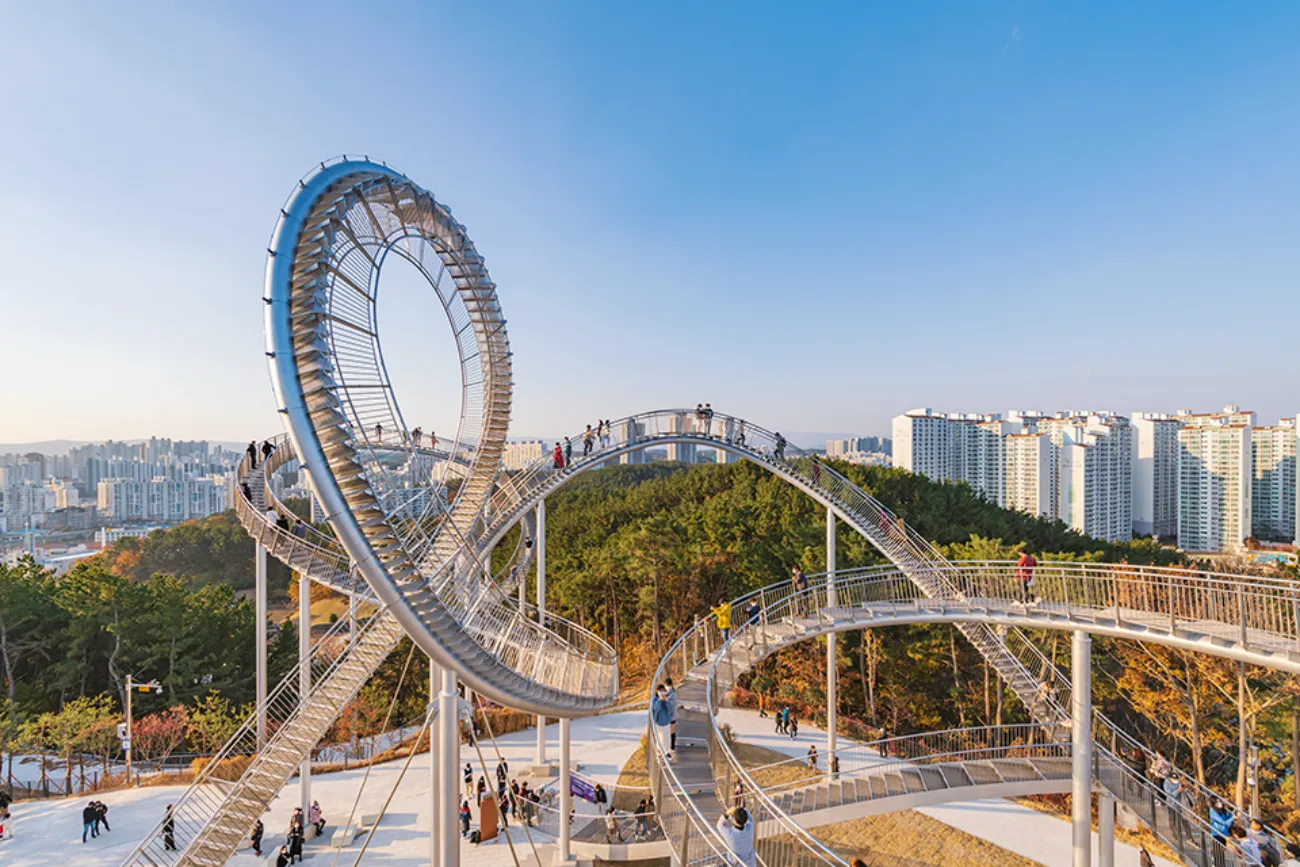 경북 포항 환호공원에 있는 ‘스페이스워크’는 국내 착시 여행지의 대표격으로 꼽힌다. 총 길이 333m의 철제 구조물은 멀리서 보면 롤러코스터처럼 보이지만, 실제로는 사람이 직접 걸을 수 있는 도보형 트랙이다.